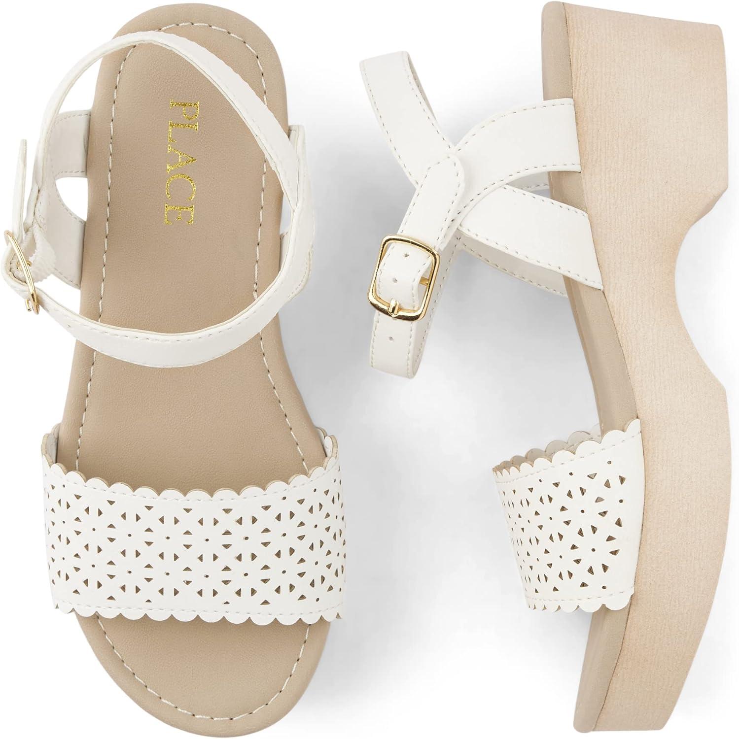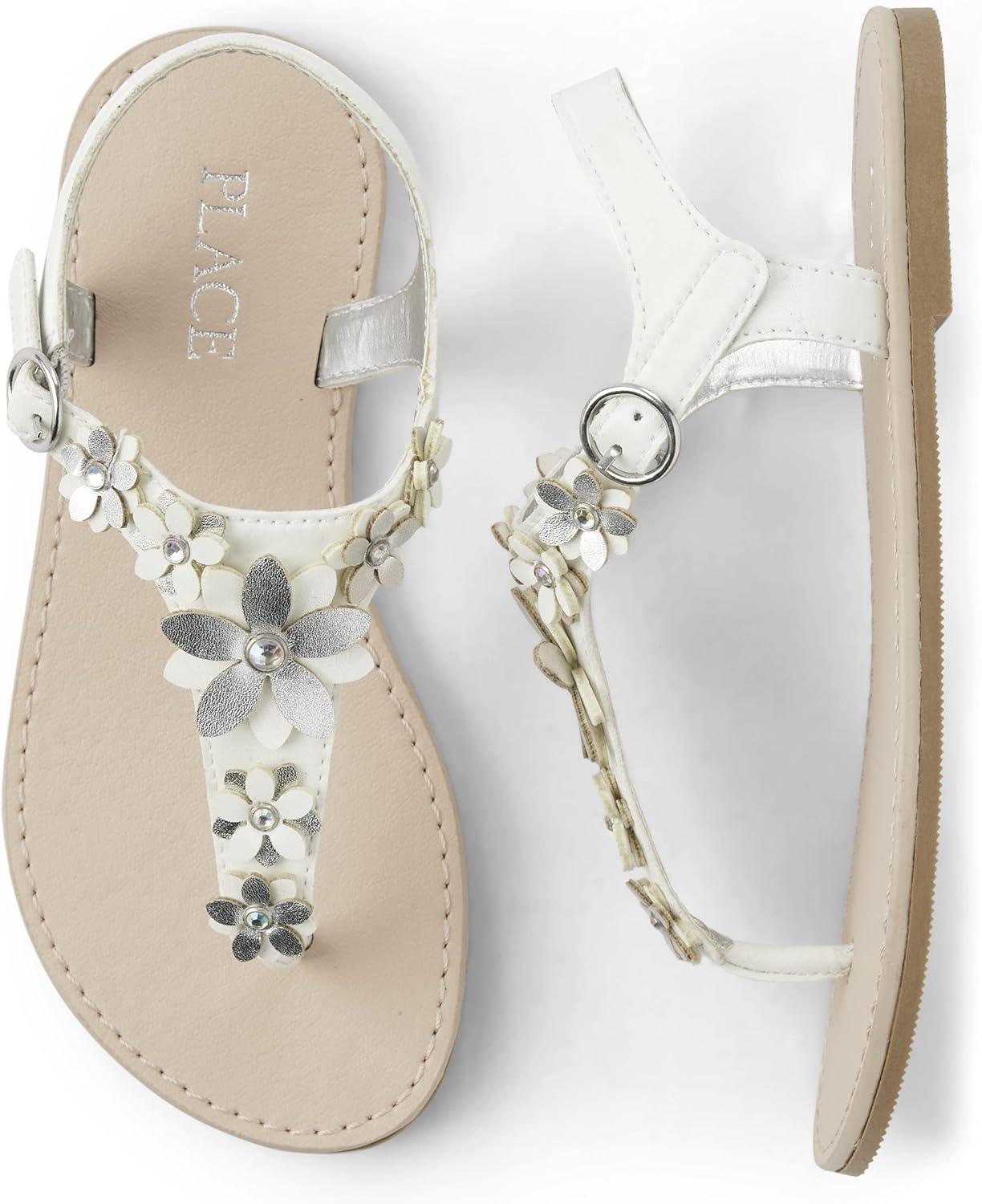 The Children’s Place Girls T-Strap Sandals with Adjustable Ankle Strap(White Flower)