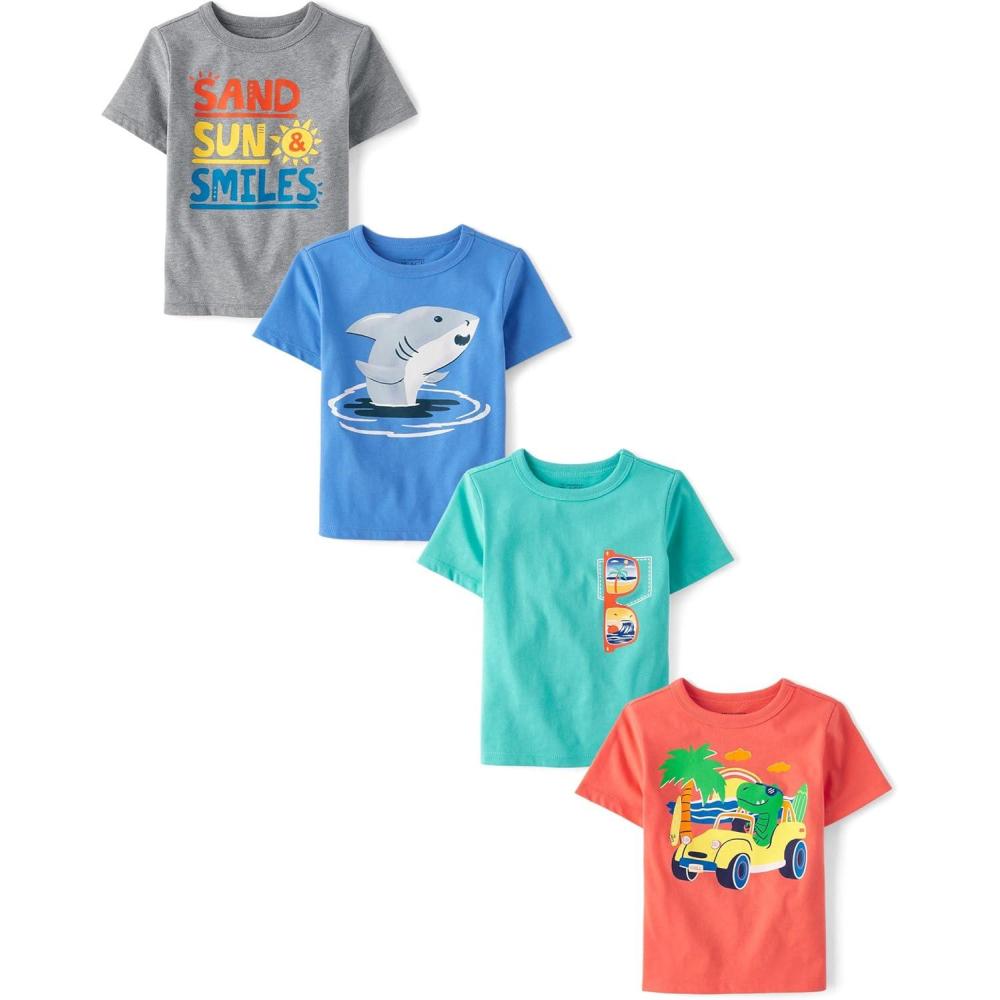 The Children’s Place Baby-Boys and Toddler Dinos,Animals,Cars Short Sleeve Graphic T-Shirts,4 Pack(Monster Truck/Shark/Sunglasses/Sand)