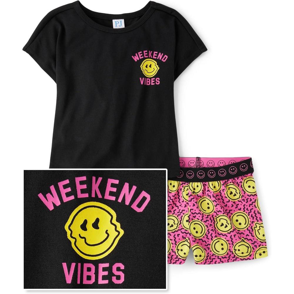 The Children’s Place girls Short Sleeve Top and Shorts,2 Piece Pajama Set(Happy Face Vibes)